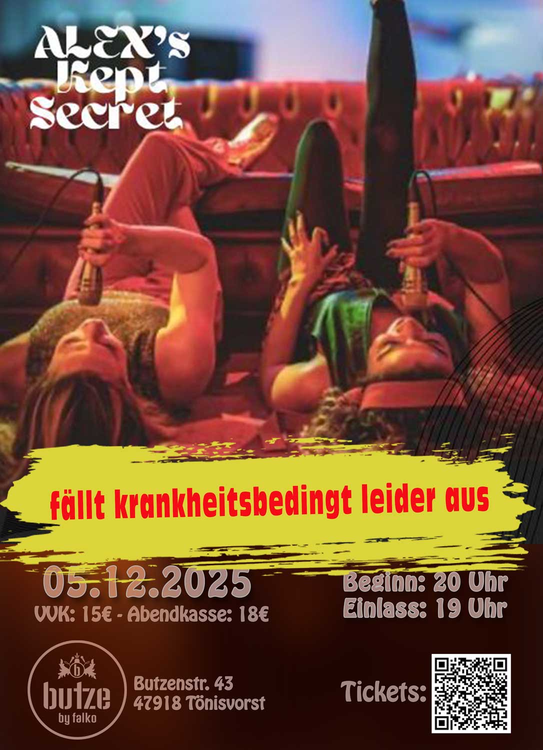 Loading view. Events Search and Views Navigation Search Enter Keyword. Search for Events by Keyword. Find Events Event Views Navigation Day List Month Day Today 05.12.2025 Fr. 12/05, 2025 Select date. 19:00 Dezember 5 @ 19:00 - 23:59 ALEX’s KEPT SECRET – New Urban Soul Butze Butzenstr. 43, Tönisvorst ALEX’s KEPT SECRET ? … fällt krankheitsbedingt leider aus! Previous Day Next Day Subscribe to calendar Google Kalender iCalendar Outlook 365 Outlook Live .ics-Datei exportieren Exportiere Outlook .ics Datei